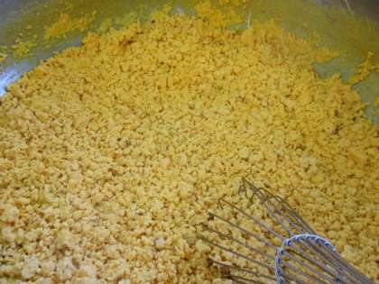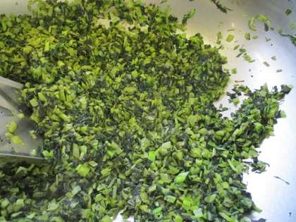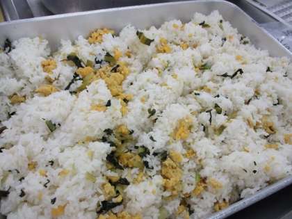 「菜の花ごはん」は小松菜といり卵をごはんに混ぜ、「菜の花」をイメージして作ったごはんです。小松菜とたまごは「八王子産」を使用しました。小松菜はごま油で炒め、いり卵は20キログラムの卵をできる限り細かく作り、ごはんに混ぜました。