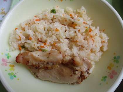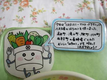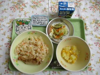 8日の給食はガーリックピラフ、八王子ハニーマスタードチキン、コーンポテト、コールスローサラダ、牛乳です。
