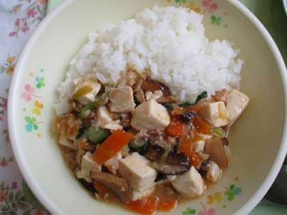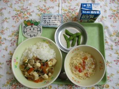 11日の給食はごはん、豆腐のうま煮、トマトと卵のスープ、枝豆、牛乳です。豆腐のうま煮には、たくさんの豆腐、野菜、豚肉を使って作りました。栄養満点です。