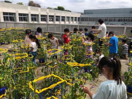 上の写真は、2階のテラスでアサガオの世話をしている1年生のようすです。