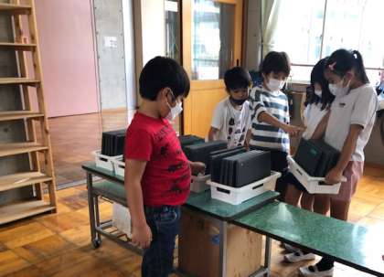 下の写真は、教室前の保管庫から学習用端末を運び出して、各自家庭に持ち帰る準備をしている2年生のようすです。