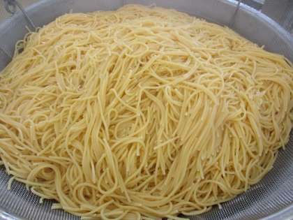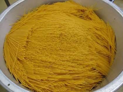 この日のスパゲティーは67キログラム使いました。このスパゲティーを三回に分けて茹でます。一回22キログラムくらいですね。釜にいっぱいお湯を沸かし、ちょうど良いかたさに茹でます。量が多いので、くっつかないように茹でるのが難しいですが、みなさんの大好きなスパゲティーですので、がんばって茹でてます!!