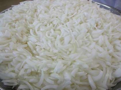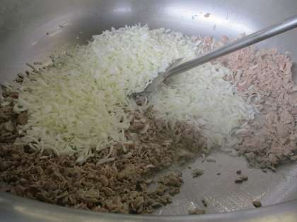 この日のたまねぎは40キログラム。大小様々なかわいいたまねぎで、地域を限定して作ってくださっていることがわかります。まず、お肉を炒め、半分たまねぎを入れて炒めていきます。