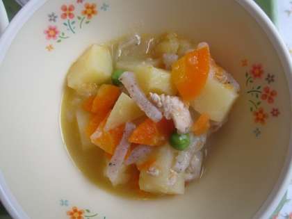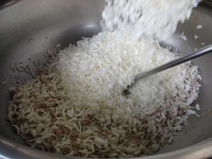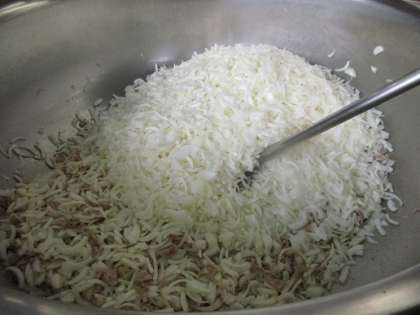 残りの半分のたまねぎを入れて、さらによく炒めます。味は酒、砂糖、塩のみです。この日のじゃがいもは「八王子産」