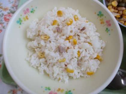 15日の給食はコーンピラフ、パンプキンシチュー、豆サラダ、牛乳です。ピラフにはコーンを20キログラム使いました。甘みのあるおいしいピラフに仕上がりました。