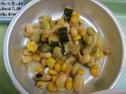 豆サラダには黄色大豆と青大豆の二種類を使いました。どちらも乾燥豆からコトコトしっかり茹でて使用します。一緒に使う野菜も大豆に合わせてコロコロに切りそろえます。お皿が分かれるとついつい残りがちですが、できたら小皿料理から食べてもらえると残りにくくなるかな?と思っています。