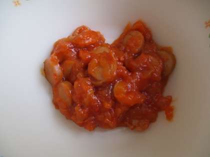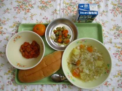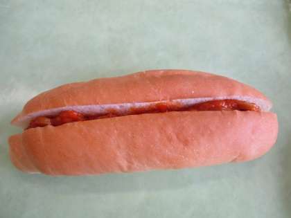 19日の給食はサルササンド、野菜のスープ煮、コロコロピクルス、果物(冷凍みかん)、牛乳です。パンにはサルサソースを挟みます。国産豚肉使用無添加ウィンナーをたくさん使って作った「サルサソース」です。「サルサ」とは、スペイン語で「ソース」という意味です。色々なサルサソースがありますが、トマトやたまねぎを使った辛めのソースが多いようです。給食のサルサソースは辛くありません。挟んだ感じはこのようでした。