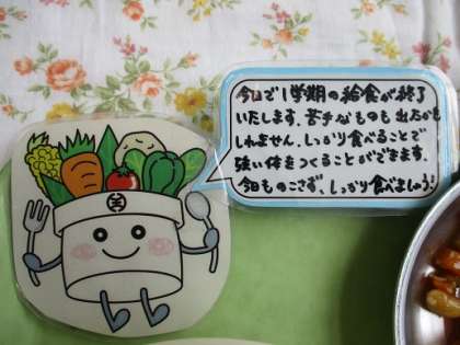 ご家庭におかれましてはお子さんが持ち帰った給食白衣の洗濯、アイロンかけ、繕い等ご協力いただきありがとうございました。二学期の給食は8月29日(月)から開始いたします。一学期同様、安全で美味しい給食を作ってまいりますので、よろしくお願いいたします。