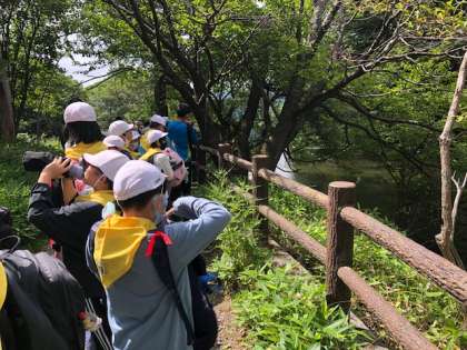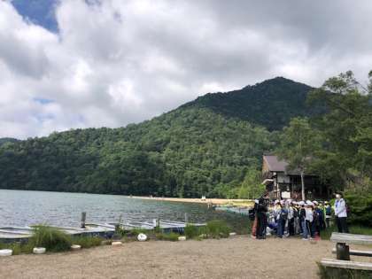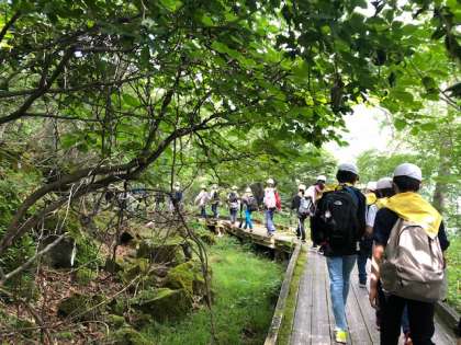 湯の湖畔でクラス写真を撮影してからハイキングがスタートしました。ガイドさんとは湯滝で合流の予定です。