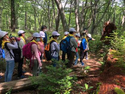 2枚目の写真は、倒木更新の説明を受けている場面です。宇津貫緑地の散策や里山講演会などで「萌芽更新」を教わったことはありますが「倒木更新」は今回初めて知った子が多かったようでした。倒木から若い木が育っている事実を目前にして、不思議そうな表情でいつまでも見入っていました。