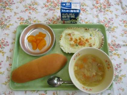 26日の給食はパン、ポテトグラタン、ABCスープ、果物(みかん缶)、牛乳です。ABCスープはとても人気のスープです。ホールトマトを入れたり、カレー味であったりしますが、どの味でも人気です。スープの下に沈みがちですが、アルファベットのマカロニがとてもかわいく、探しながら楽しんで食べることができるスープです。