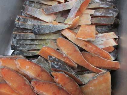 「鮭の焼き漬け」は焼いた鮭をしょうゆダレに漬け込む料理です。新潟県の北にある村上市は「鮭のまち」とよばれています。鮭を頭から尾まで大切に食べる文化のある村上市には100種類以上の料理法があると言われています。