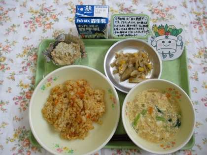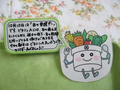 10日の給食は「目の愛護デー献立」の、人参ごはん、ミニいが蒸し、かきたま汁、キャベツのごまじょうゆ風味、牛乳です。10月10日は『目の愛護デー(目を大切にしようという日)』です。10と10を横に倒すと、まゆ毛と目の形になることから、この日になったそうです。スマートフォンやパソコンやゲームなどで長時間 目を使っていませんか?大切な目を守るために、時間を決めて、目を使い続けないように注意しましょう。