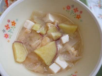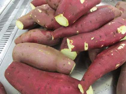 徳島県産ブランドのさつまいも「なると金時」は、きめ細かく、美しい外見と上質な甘みを兼ね備えています。給食では八王子産のおいしい「さつまいも」を使って、みそ汁を作りました。甘みのあるおいしい「さつまいものみそ汁」になりました。