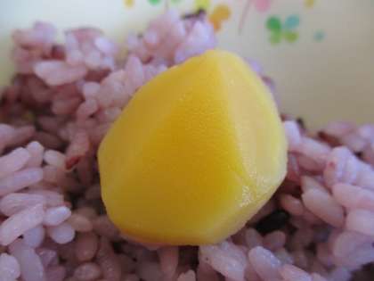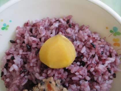 黒米を入れて色づけしたごはんに、甘く煮た国産栗を1つのせました。