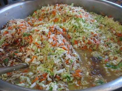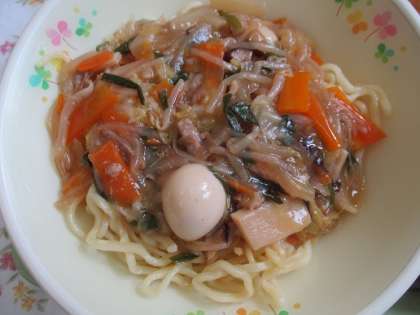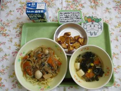 13日の給食は、あんかけやきそば、わかめスープ、大学芋、牛乳です。あんかけやきそばにかける「あん」には、野菜をたっぷり使いました。栄養満点です。残りも非常に少なかったです。