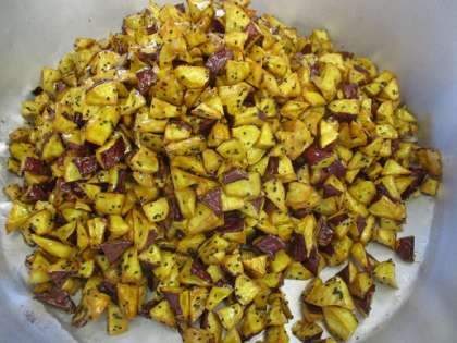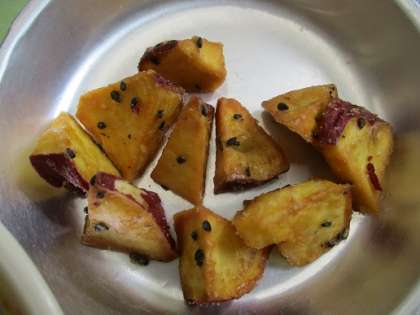 カリッと揚がった「さつまいも」に給食室特製のタレを和えて、出来上がりです。あんかけやきそば同様残りがほとんどありませんでした。