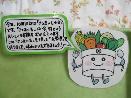 10月13日は「さつまいもの日」です。何故、この日が「さつまいもの日」になったかというと「さつまいもの旬が10月であること」と、「江戸時代の焼き芋屋さんが、さつまいもを『十三里』と名付けたこと」が関係しています。何故、「十三里」かというと「焼き芋屋さんが『九里(栗くり)四里(より)うまい十三里 (9+4=13)』「栗よりも焼き芋がおいしいよ!」と宣伝したことからや、さつまいもの名産地の埼玉県川越市が、江戸から十三里(約52km)離れているからなどと言われています。少し難しいですが、おもしろいですね。
