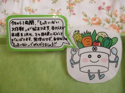 16日から「もったいない大作戦ウィーク」が始まっています。各クラスでたてた「目標」にむかって、自分なりの「もったいない」を考えながら無理をしないで頑張る運動です。