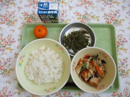 14日の給食は、ごはん、生揚げと豚肉の味噌炒め、茎わかめのしょうが炒め、果物(みかん)、牛乳です。