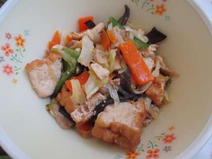 地元のおいしいお豆腐屋さんから38キログラムの生揚げを納品していただきました。一口大に切り、調味料で煮含めてから野菜炒めに加えました。栄養満点です。