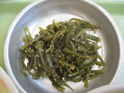 茎わかめのしょうが炒めの「茎わかめ」は水で戻して使いますが、戻す時間が短いと塩気が抜けず、戻しすぎると塩気がなく、ぬめりが出てしまうため、シャキシャキに戻すタイミングが難しいです。今回も歯ごたえのよい、おいしい「茎わかめのしょうが炒め」に仕上がりました。苦手な子もいますが、どちらかというと「大好き!」という子が多い献立です。