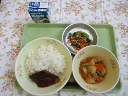 8日の給食は、ごはん、さばの韓国風味噌煮、カムジャタン、三色ナムル、牛乳です。「さば」は味噌で煮込み、少々豆板醤を加えてピリカラに作りました。