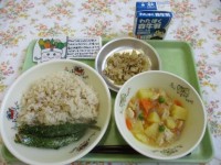新たまねぎ、豚ひき肉をたっぷり使ったドライカレーの具です。新たまねぎは、甘みはあるのですが通常のたまねぎよりもたくさんの水分が出てきます。給食室手作りカレールーを加えてとろみをつけます。レーズンを加えることによって、さらに甘みが増します。