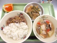 19日の給食は「卒業おめでとう献立」の赤飯、鰆の西京焼き、いりどり、彩り和え、果...
