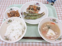 ●今日の給食●・ごはん・ししゃもの磯辺天ぷら・ビーフン炒め・豚と豆の角煮風・みそ...