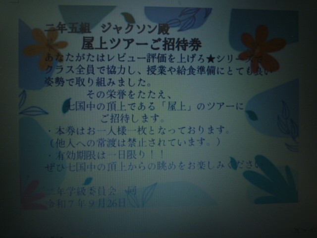 当日、学級委員がデザインした切符を手にした5組の生徒たちは、昼休みに屋上へ上がり、ご褒美を堪能したようです。