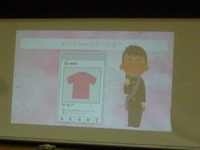 「ピンクシャツデー」という、カナダの学生から始まった、世界中に広まっているいじめ反対運動からヒントを得て、生徒会役員が発案した運動です。
