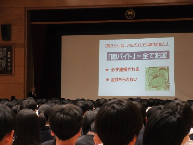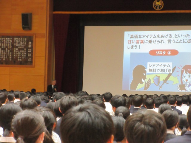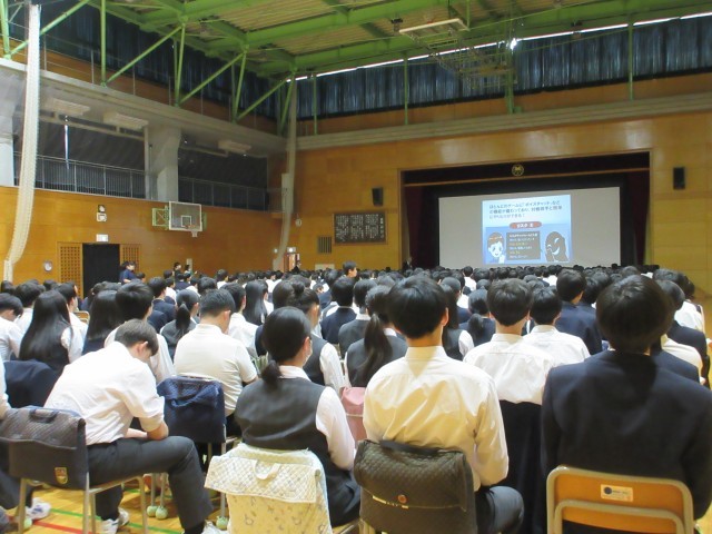 体育館に集まった生徒たちは、講師の方の真剣なまなざしとお話に、しっかりと耳を傾けていました。