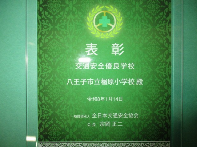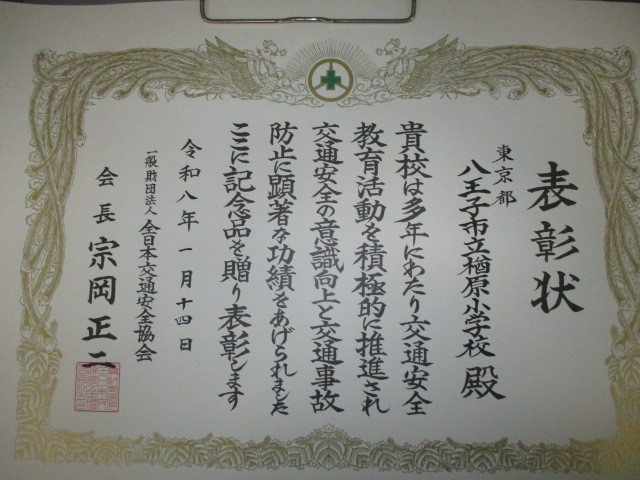 5・6年生中心に毎年がんばっている「交通安全子供自転車東京大会」などの取組みを認めていただき、交通安全にかんする表彰をいただきました。