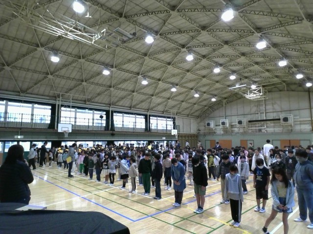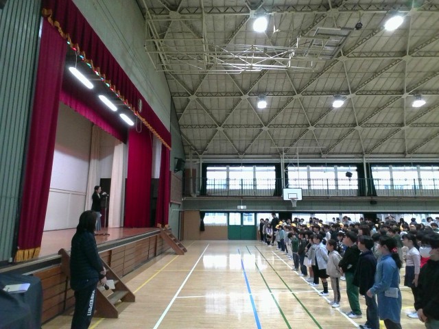 今朝は雨が降っていましたので、体育館で朝会を行いました。
