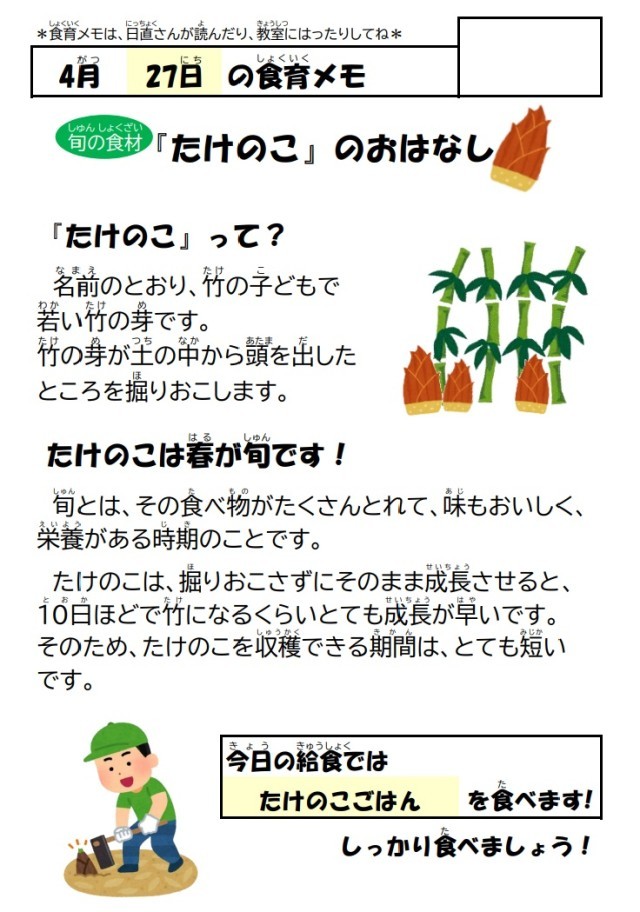 ※今日は今が旬で一番おいしく栄養たっぷりのたけのこを使って