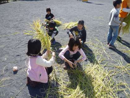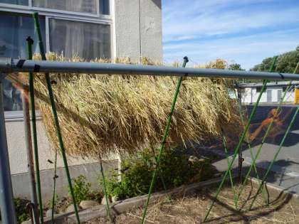 刈り終えた稲は、きちんと端をそろえて結び、きれいに干しました。