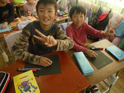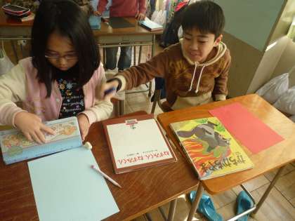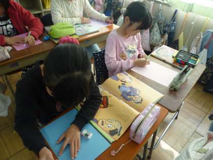 2年生との図書交流に向けて、本を紹介するポスター書きをしています。