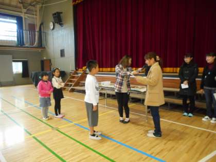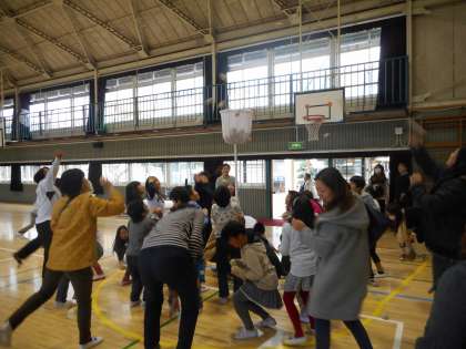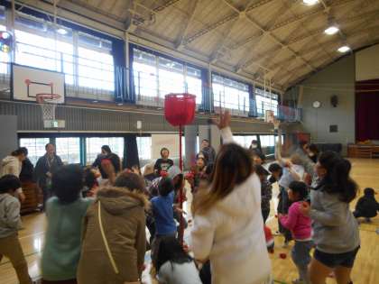 楢原小の先生にまつわる○×クイズに楽しんだあと、去年の運動会以来の玉入れ競争をしました。最後のプレゼントにも、大喜びでした。