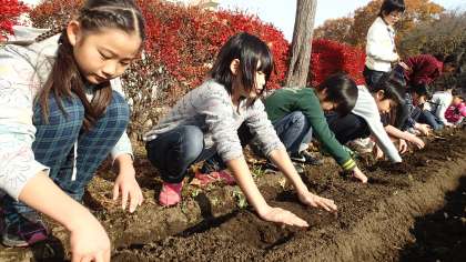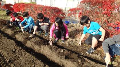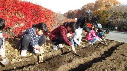 球根を向きや穴の深さに注意し、心を込めて、植えています。
