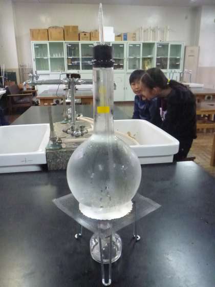 ・フラスコに水を入れ、ゴム栓付ガラス棒を付けて、アルコールランプで温めます。