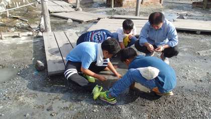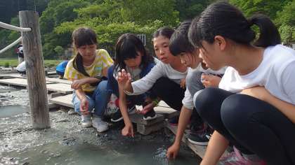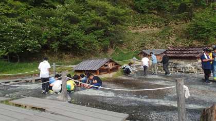 湯ノ湖の源泉で、化学変化の実験をしています。