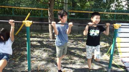 休み時間に、鉄棒練習に励んでいます。