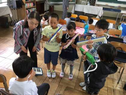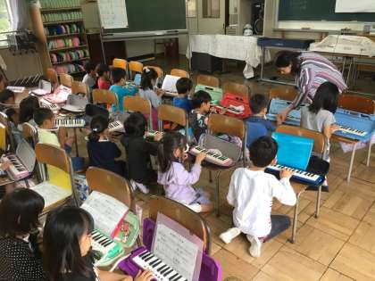 「山びこごっこ」を鍵盤ハーモニカで演奏する学習に取り組みました。友達のつくったリズムや旋律をまねして演奏することを楽しみました。