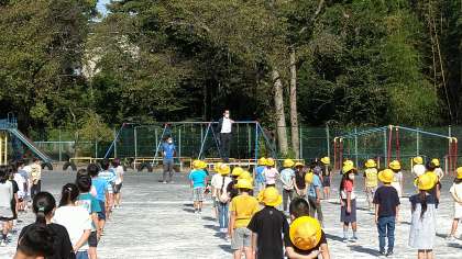 給食後の時間は、全校集会です。運動会の前なので、運動会隊型で並びました。