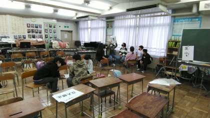 用具 ライン係は、音楽室でレース表示の担当の確認し会場で見せる練習をしていました。ライン担当はどのラインをいつ誰が引くかを図で確認しました。