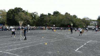 全校競技「玉入れ」の準備です。カゴが、12台セットされます。