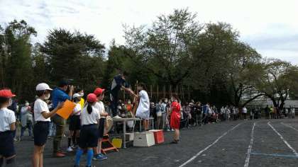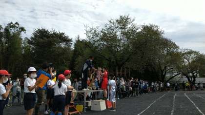 優勝杯が、赤組団長に授与されました。白組団長には、準優勝盾の授与です。