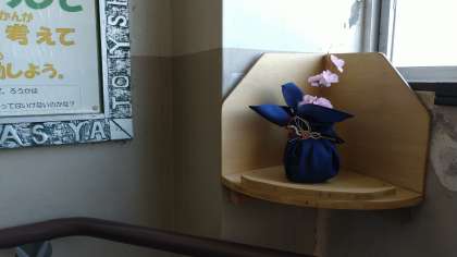 冬の楢原小ではありますが、新春らしさを見つけました。まず階段踊場装飾です。