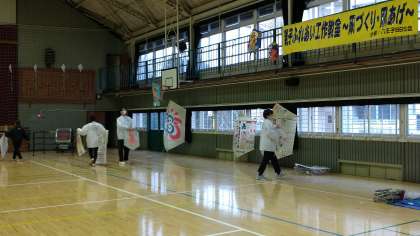 八王子BBS会の皆さんと講師の皆さんが、朝早くから集まって、体育館を凧づくりの会場にセッティングします。